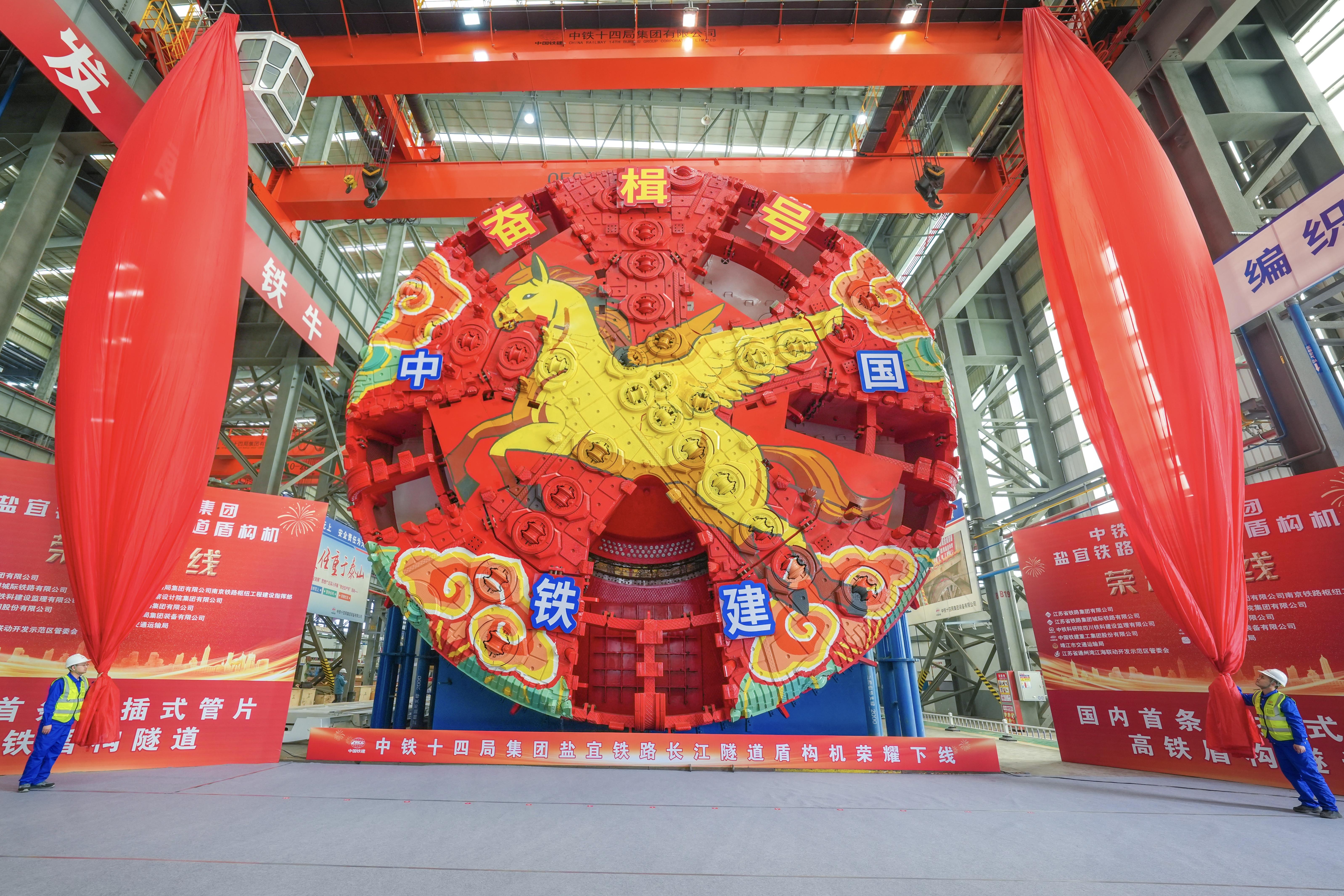 3月31日,由中国铁建打造的一台国产14米级超大直径盾构机“奋楫号”在江苏南通顺利下线,将用于新建盐城经泰州无锡常州至宜兴高铁(以下简称“盐宜高铁”)长江隧道工程。该工程是国内首条采用承插式管片的高铁盾构隧道。